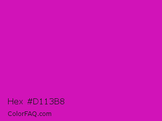 Hex #d113b8 Color is a normal magenta color and the nearest color is Deep Magenta #cc00cc. Hex code #d113b8 and RGB value is rgb(209,19,184). In RGB color space, this color is composed of 82% red, 7% green, 72% blue, In CMYK color space, this color is composed of 0% cyan, 91% magenta, 12% yellow , 18% black , In HSL color space, this color has a hue angle of 308° , 83% saturation and 45% lightness.