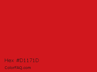 Hex #d1171d Color is a normal red color and the nearest color is Lava #cf1020. Hex code #d1171d and RGB value is rgb(209,23,29). In RGB color space, this color is composed of 82% red, 9% green, 11% blue, In CMYK color space, this color is composed of 0% cyan, 89% magenta, 86% yellow , 18% black , In HSL color space, this color has a hue angle of 358° , 80% saturation and 45% lightness.