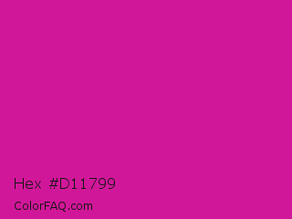 Hex #d11799 Color is a normal magenta color and the nearest color is Red Violet #c71585. Hex code #d11799 and RGB value is rgb(209,23,153). In RGB color space, this color is composed of 82% red, 9% green, 60% blue, In CMYK color space, this color is composed of 0% cyan, 89% magenta, 27% yellow , 18% black , In HSL color space, this color has a hue angle of 318° , 80% saturation and 45% lightness.