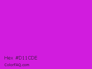 Hex #d11cde Color is a normal magenta color and the nearest color is Steel Pink #cc33cc. Hex code #d11cde and RGB value is rgb(209,28,222). In RGB color space, this color is composed of 82% red, 11% green, 87% blue, In CMYK color space, this color is composed of 6% cyan, 87% magenta, 0% yellow , 13% black , In HSL color space, this color has a hue angle of 296° , 78% saturation and 49% lightness.