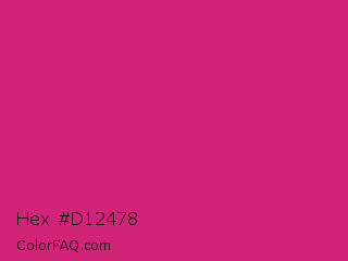 Hex #d12478 Color is a normal rose color and the nearest color is Magenta Dye #ca1f7b. Hex code #d12478 and RGB value is rgb(209,36,120). In RGB color space, this color is composed of 82% red, 14% green, 47% blue, In CMYK color space, this color is composed of 0% cyan, 83% magenta, 43% yellow , 18% black , In HSL color space, this color has a hue angle of 331° , 71% saturation and 48% lightness.