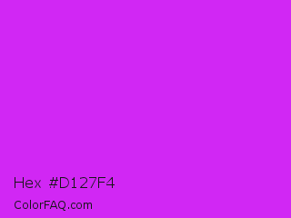 Hex #d127f4 Color is a normal purple color and the nearest color is Vivid Mulberry #b80ce3. Hex code #d127f4 and RGB value is rgb(209,39,244). In RGB color space, this color is composed of 82% red, 15% green, 96% blue, In CMYK color space, this color is composed of 14% cyan, 84% magenta, 0% yellow , 4% black , In HSL color space, this color has a hue angle of 290° , 90% saturation and 55% lightness.