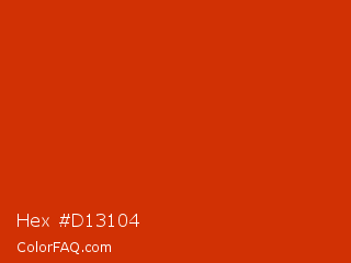 Hex #d13104 Color is a normal red color and the nearest color is Sinopia #cb410b. Hex code #d13104 and RGB value is rgb(209,49,4). In RGB color space, this color is composed of 82% red, 19% green, 2% blue, In CMYK color space, this color is composed of 0% cyan, 77% magenta, 98% yellow , 18% black , In HSL color space, this color has a hue angle of 13° , 96% saturation and 42% lightness.