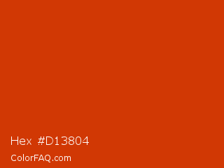 Hex #d13804 Color is a normal color and the nearest color is Sinopia #cb410b. Hex code #d13804 and RGB value is rgb(209,56,4). In RGB color space, this color is composed of 82% red, 22% green, 2% blue, In CMYK color space, this color is composed of 0% cyan, 73% magenta, 98% yellow , 18% black , In HSL color space, this color has a hue angle of 15° , 96% saturation and 42% lightness.