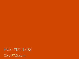 Hex #d14702 Color is a normal orange color and the nearest color is Grenadier #d54600. Hex code #d14702 and RGB value is rgb(209,71,2). In RGB color space, this color is composed of 82% red, 28% green, 1% blue, In CMYK color space, this color is composed of 0% cyan, 66% magenta, 99% yellow , 18% black , In HSL color space, this color has a hue angle of 20° , 98% saturation and 41% lightness.