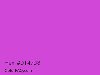 Hex #d147d8 Color is a normal magenta color and the nearest color is Steel Pink #cc33cc. Hex code #d147d8 and RGB value is rgb(209,71,216). In RGB color space, this color is composed of 82% red, 28% green, 85% blue, In CMYK color space, this color is composed of 3% cyan, 67% magenta, 0% yellow , 15% black , In HSL color space, this color has a hue angle of 297° , 65% saturation and 56% lightness.