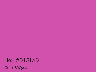 Hex #d151ad Color is a normal magenta color and the nearest color is Fuchsia Pink #c154c1. Hex code #d151ad and RGB value is rgb(209,81,173). In RGB color space, this color is composed of 82% red, 32% green, 68% blue, In CMYK color space, this color is composed of 0% cyan, 61% magenta, 17% yellow , 18% black , In HSL color space, this color has a hue angle of 317° , 58% saturation and 57% lightness.