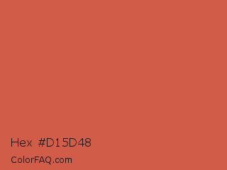 Hex #d15d48 Color is a normal red color and the nearest color is Dark Coral #cd5b45. Hex code #d15d48 and RGB value is rgb(209,93,72). In RGB color space, this color is composed of 82% red, 36% green, 28% blue, In CMYK color space, this color is composed of 0% cyan, 56% magenta, 66% yellow , 18% black , In HSL color space, this color has a hue angle of 9° , 60% saturation and 55% lightness.