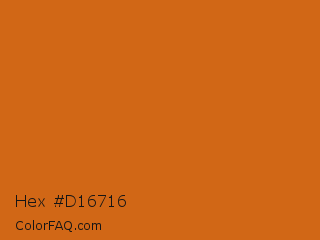 Hex #d16716 Color is a normal orange color and the nearest color is Hot Cinnamon #d2691e. Hex code #d16716 and RGB value is rgb(209,103,22). In RGB color space, this color is composed of 82% red, 40% green, 9% blue, In CMYK color space, this color is composed of 0% cyan, 51% magenta, 89% yellow , 18% black , In HSL color space, this color has a hue angle of 26° , 81% saturation and 45% lightness.