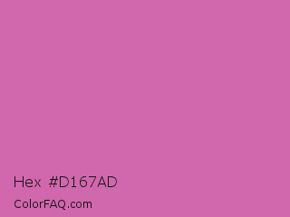 Hex #d167ad Color is a light magenta color and the nearest color is Super Pink #cf6ba9. Hex code #d167ad and RGB value is rgb(209,103,173). In RGB color space, this color is composed of 82% red, 40% green, 68% blue, In CMYK color space, this color is composed of 0% cyan, 51% magenta, 17% yellow , 18% black , In HSL color space, this color has a hue angle of 320° , 54% saturation and 61% lightness.