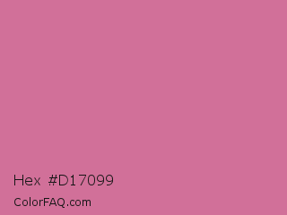 Hex #d17099 Color is a light rose color and the nearest color is Charm #d47494. Hex code #d17099 and RGB value is rgb(209,112,153). In RGB color space, this color is composed of 82% red, 44% green, 60% blue, In CMYK color space, this color is composed of 0% cyan, 46% magenta, 27% yellow , 18% black , In HSL color space, this color has a hue angle of 335° , 51% saturation and 63% lightness.