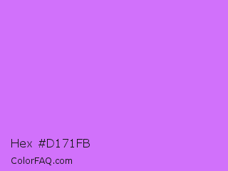 Hex #d171fb Color is a light purple color and the nearest color is Heliotrope #df73ff. Hex code #d171fb and RGB value is rgb(209,113,251). In RGB color space, this color is composed of 82% red, 44% green, 98% blue, In CMYK color space, this color is composed of 17% cyan, 55% magenta, 0% yellow , 2% black , In HSL color space, this color has a hue angle of 282° , 95% saturation and 71% lightness.