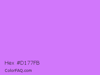 Hex #d177fb Color is a light purple color and the nearest color is Heliotrope #df73ff. Hex code #d177fb and RGB value is rgb(209,119,251). In RGB color space, this color is composed of 82% red, 47% green, 98% blue, In CMYK color space, this color is composed of 17% cyan, 53% magenta, 0% yellow , 2% black , In HSL color space, this color has a hue angle of 281° , 94% saturation and 73% lightness.