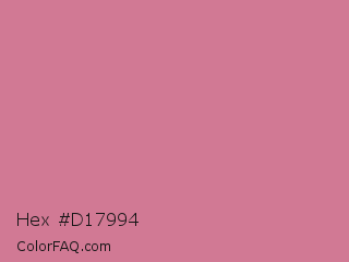 Hex #d17994 Color is a light rose color and the nearest color is Charm #d47494. Hex code #d17994 and RGB value is rgb(209,121,148). In RGB color space, this color is composed of 82% red, 47% green, 58% blue, In CMYK color space, this color is composed of 0% cyan, 42% magenta, 29% yellow , 18% black , In HSL color space, this color has a hue angle of 342° , 49% saturation and 65% lightness.