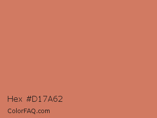 Hex #d17a62 Color is a normal red color and the nearest color is Japonica #d87c63. Hex code #d17a62 and RGB value is rgb(209,122,98). In RGB color space, this color is composed of 82% red, 48% green, 38% blue, In CMYK color space, this color is composed of 0% cyan, 42% magenta, 53% yellow , 18% black , In HSL color space, this color has a hue angle of 13° , 55% saturation and 60% lightness.