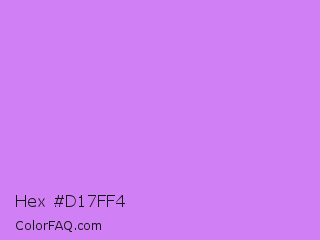 Hex #d17ff4 Color is a light purple color and the nearest color is Bright Lilac #d891ef. Hex code #d17ff4 and RGB value is rgb(209,127,244). In RGB color space, this color is composed of 82% red, 50% green, 96% blue, In CMYK color space, this color is composed of 14% cyan, 48% magenta, 0% yellow , 4% black , In HSL color space, this color has a hue angle of 282° , 84% saturation and 73% lightness.