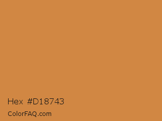 Hex #d18743 Color is a normal orange color and the nearest color is Peru #cd853f. Hex code #d18743 and RGB value is rgb(209,135,67). In RGB color space, this color is composed of 82% red, 53% green, 26% blue, In CMYK color space, this color is composed of 0% cyan, 35% magenta, 68% yellow , 18% black , In HSL color space, this color has a hue angle of 29° , 61% saturation and 54% lightness.
