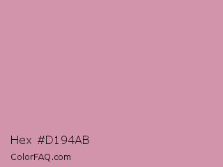 Hex #d194ab Color is a light rose color and the nearest color is Viola #cb8fa9. Hex code #d194ab and RGB value is rgb(209,148,171). In RGB color space, this color is composed of 82% red, 58% green, 67% blue, In CMYK color space, this color is composed of 0% cyan, 29% magenta, 18% yellow , 18% black , In HSL color space, this color has a hue angle of 337° , 40% saturation and 70% lightness.
