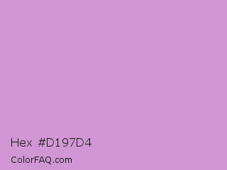 Hex #d197d4 Color is a light magenta color and the nearest color is Light Grayish Magenta #cc99cc. Hex code #d197d4 and RGB value is rgb(209,151,212). In RGB color space, this color is composed of 82% red, 59% green, 83% blue, In CMYK color space, this color is composed of 1% cyan, 29% magenta, 0% yellow , 17% black , In HSL color space, this color has a hue angle of 297° , 41% saturation and 71% lightness.