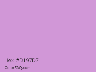 Hex #d197d7 Color is a light magenta color and the nearest color is Light Grayish Magenta #cc99cc. Hex code #d197d7 and RGB value is rgb(209,151,215). In RGB color space, this color is composed of 82% red, 59% green, 84% blue, In CMYK color space, this color is composed of 3% cyan, 30% magenta, 0% yellow , 16% black , In HSL color space, this color has a hue angle of 294° , 44% saturation and 72% lightness.