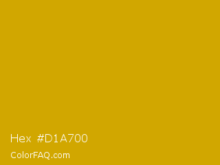 Hex #d1a700 Color is a normal yellow color and the nearest color is Vivid Amber #cc9900. Hex code #d1a700 and RGB value is rgb(209,167,0). In RGB color space, this color is composed of 82% red, 65% green, 0% blue, In CMYK color space, this color is composed of 0% cyan, 20% magenta, 100% yellow , 18% black , In HSL color space, this color has a hue angle of 48° , 100% saturation and 41% lightness.