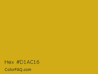 Hex #d1ac16 Color is a normal yellow color and the nearest color is Lemon Curry #cca01d. Hex code #d1ac16 and RGB value is rgb(209,172,22). In RGB color space, this color is composed of 82% red, 67% green, 9% blue, In CMYK color space, this color is composed of 0% cyan, 18% magenta, 89% yellow , 18% black , In HSL color space, this color has a hue angle of 48° , 81% saturation and 45% lightness.