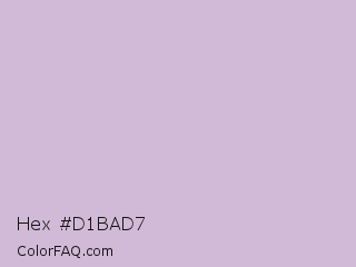 Hex #d1bad7 Color is a light purple color and the nearest color is Thistle #d8bfd8. Hex code #d1bad7 and RGB value is rgb(209,186,215). In RGB color space, this color is composed of 82% red, 73% green, 84% blue, In CMYK color space, this color is composed of 3% cyan, 13% magenta, 0% yellow , 16% black , In HSL color space, this color has a hue angle of 288° , 27% saturation and 79% lightness.