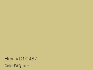 Hex #d1c487 Color is a light yellow color and the nearest color is Straw #d4bf8d. Hex code #d1c487 and RGB value is rgb(209,196,135). In RGB color space, this color is composed of 82% red, 77% green, 53% blue, In CMYK color space, this color is composed of 0% cyan, 6% magenta, 35% yellow , 18% black , In HSL color space, this color has a hue angle of 49° , 45% saturation and 67% lightness.