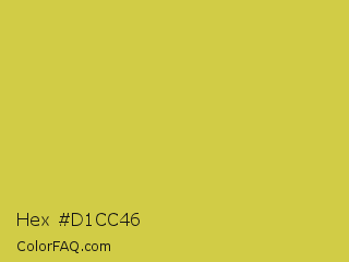 Hex #d1cc46 Color is a normal yellow color and the nearest color is Wattle #dcd747. Hex code #d1cc46 and RGB value is rgb(209,204,70). In RGB color space, this color is composed of 82% red, 80% green, 27% blue, In CMYK color space, this color is composed of 0% cyan, 2% magenta, 67% yellow , 18% black , In HSL color space, this color has a hue angle of 58° , 60% saturation and 55% lightness.