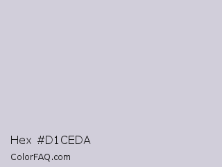 Hex #d1ceda Color is a very light indigo color and the nearest color is Mischka #d1d2dd. Hex code #d1ceda and RGB value is rgb(209,206,218). In RGB color space, this color is composed of 82% red, 81% green, 85% blue, In CMYK color space, this color is composed of 4% cyan, 6% magenta, 0% yellow , 15% black , In HSL color space, this color has a hue angle of 255° , 14% saturation and 83% lightness.