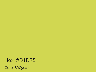 Hex #d1d751 Color is a normal yellow color and the nearest color is Wattle #dcd747. Hex code #d1d751 and RGB value is rgb(209,215,81). In RGB color space, this color is composed of 82% red, 84% green, 32% blue, In CMYK color space, this color is composed of 3% cyan, 0% magenta, 62% yellow , 16% black , In HSL color space, this color has a hue angle of 63° , 63% saturation and 58% lightness.