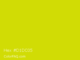 Hex #d1dc05 Color is a normal yellow color and the nearest color is Bitter Lemon #cae00d. Hex code #d1dc05 and RGB value is rgb(209,220,5). In RGB color space, this color is composed of 82% red, 86% green, 2% blue, In CMYK color space, this color is composed of 5% cyan, 0% magenta, 98% yellow , 14% black , In HSL color space, this color has a hue angle of 63° , 96% saturation and 44% lightness.