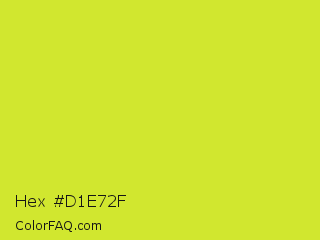 Hex #d1e72f Color is a normal yellow color and the nearest color is Pear #d1e231. Hex code #d1e72f and RGB value is rgb(209,231,47). In RGB color space, this color is composed of 82% red, 91% green, 18% blue, In CMYK color space, this color is composed of 10% cyan, 0% magenta, 80% yellow , 9% black , In HSL color space, this color has a hue angle of 67° , 79% saturation and 55% lightness.
