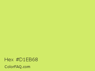 Hex #d1eb68 Color is a light lime color and the nearest color is Booger Buster #dde26a. Hex code #d1eb68 and RGB value is rgb(209,235,104). In RGB color space, this color is composed of 82% red, 92% green, 41% blue, In CMYK color space, this color is composed of 11% cyan, 0% magenta, 56% yellow , 8% black , In HSL color space, this color has a hue angle of 72° , 77% saturation and 66% lightness.