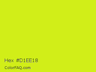 Hex #d1ee18 Color is a normal yellow color and the nearest color is Las Palmas #c6e610. Hex code #d1ee18 and RGB value is rgb(209,238,24). In RGB color space, this color is composed of 82% red, 93% green, 9% blue, In CMYK color space, this color is composed of 12% cyan, 0% magenta, 90% yellow , 7% black , In HSL color space, this color has a hue angle of 68° , 86% saturation and 51% lightness.