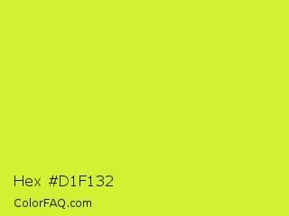 Hex #d1f132 Color is a normal yellow color and the nearest color is Pear #d1e231. Hex code #d1f132 and RGB value is rgb(209,241,50). In RGB color space, this color is composed of 82% red, 95% green, 20% blue, In CMYK color space, this color is composed of 13% cyan, 0% magenta, 79% yellow , 5% black , In HSL color space, this color has a hue angle of 70° , 87% saturation and 57% lightness.