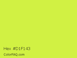 Hex #d1f143 Color is a normal lime color and the nearest color is Maximum Green Yellow #d9e650. Hex code #d1f143 and RGB value is rgb(209,241,67). In RGB color space, this color is composed of 82% red, 95% green, 26% blue, In CMYK color space, this color is composed of 13% cyan, 0% magenta, 72% yellow , 5% black , In HSL color space, this color has a hue angle of 71° , 86% saturation and 60% lightness.