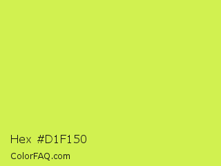 Hex #d1f150 Color is a light lime color and the nearest color is Maximum Green Yellow #d9e650. Hex code #d1f150 and RGB value is rgb(209,241,80). In RGB color space, this color is composed of 82% red, 95% green, 31% blue, In CMYK color space, this color is composed of 13% cyan, 0% magenta, 67% yellow , 5% black , In HSL color space, this color has a hue angle of 72° , 85% saturation and 63% lightness.