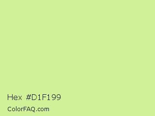 Hex #d1f199 Color is a light green color and the nearest color is Reef #c9ffa2. Hex code #d1f199 and RGB value is rgb(209,241,153). In RGB color space, this color is composed of 82% red, 95% green, 60% blue, In CMYK color space, this color is composed of 13% cyan, 0% magenta, 37% yellow , 5% black , In HSL color space, this color has a hue angle of 82° , 76% saturation and 77% lightness.