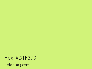 Hex #d1f379 Color is a light lime color and the nearest color is Sulu #c1f07c. Hex code #d1f379 and RGB value is rgb(209,243,121). In RGB color space, this color is composed of 82% red, 95% green, 47% blue, In CMYK color space, this color is composed of 14% cyan, 0% magenta, 50% yellow , 5% black , In HSL color space, this color has a hue angle of 77° , 84% saturation and 71% lightness.
