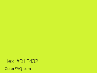 Hex #d1f432 Color is a normal lime color and the nearest color is Pear #d1e231. Hex code #d1f432 and RGB value is rgb(209,244,50). In RGB color space, this color is composed of 82% red, 96% green, 20% blue, In CMYK color space, this color is composed of 14% cyan, 0% magenta, 80% yellow , 4% black , In HSL color space, this color has a hue angle of 71° , 90% saturation and 58% lightness.