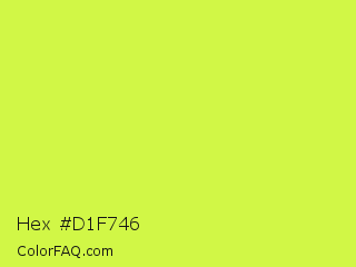 Hex #d1f746 Color is a light lime color and the nearest color is Maximum Green Yellow #d9e650. Hex code #d1f746 and RGB value is rgb(209,247,70). In RGB color space, this color is composed of 82% red, 97% green, 27% blue, In CMYK color space, this color is composed of 15% cyan, 0% magenta, 72% yellow , 3% black , In HSL color space, this color has a hue angle of 73° , 92% saturation and 62% lightness.