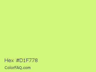 Hex #d1f778 Color is a light lime color and the nearest color is Sulu #c1f07c. Hex code #d1f778 and RGB value is rgb(209,247,120). In RGB color space, this color is composed of 82% red, 97% green, 47% blue, In CMYK color space, this color is composed of 15% cyan, 0% magenta, 51% yellow , 3% black , In HSL color space, this color has a hue angle of 78° , 89% saturation and 72% lightness.
