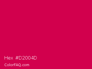 Hex #d2004d Color is a normal rose color and the nearest color is Spanish Carmine #d10047. Hex code #d2004d and RGB value is rgb(210,0,77). In RGB color space, this color is composed of 82% red, 0% green, 30% blue, In CMYK color space, this color is composed of 0% cyan, 100% magenta, 63% yellow , 18% black , In HSL color space, this color has a hue angle of 338° , 100% saturation and 41% lightness.