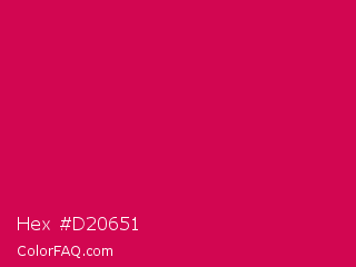 Hex #d20651 Color is a normal rose color and the nearest color is Debian Red #d70a53. Hex code #d20651 and RGB value is rgb(210,6,81). In RGB color space, this color is composed of 82% red, 2% green, 32% blue, In CMYK color space, this color is composed of 0% cyan, 97% magenta, 61% yellow , 18% black , In HSL color space, this color has a hue angle of 338° , 94% saturation and 42% lightness.