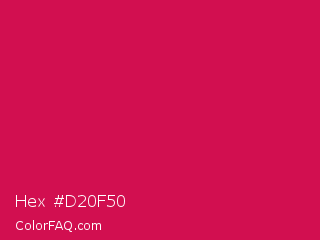 Hex #d20f50 Color is a normal rose color and the nearest color is Debian Red #d70a53. Hex code #d20f50 and RGB value is rgb(210,15,80). In RGB color space, this color is composed of 82% red, 6% green, 31% blue, In CMYK color space, this color is composed of 0% cyan, 93% magenta, 62% yellow , 18% black , In HSL color space, this color has a hue angle of 340° , 87% saturation and 44% lightness.