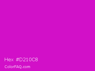 Hex #d210c8 Color is a normal magenta color and the nearest color is Deep Magenta #cc00cc. Hex code #d210c8 and RGB value is rgb(210,16,200). In RGB color space, this color is composed of 82% red, 6% green, 78% blue, In CMYK color space, this color is composed of 0% cyan, 92% magenta, 5% yellow , 18% black , In HSL color space, this color has a hue angle of 303° , 86% saturation and 44% lightness.