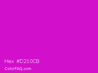 Hex #d210cb Color is a normal magenta color and the nearest color is Deep Magenta #cc00cc. Hex code #d210cb and RGB value is rgb(210,16,203). In RGB color space, this color is composed of 82% red, 6% green, 80% blue, In CMYK color space, this color is composed of 0% cyan, 92% magenta, 3% yellow , 18% black , In HSL color space, this color has a hue angle of 302° , 86% saturation and 44% lightness.