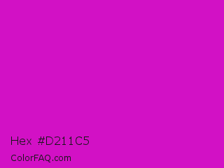 Hex #d211c5 Color is a normal magenta color and the nearest color is Deep Magenta #cc00cc. Hex code #d211c5 and RGB value is rgb(210,17,197). In RGB color space, this color is composed of 82% red, 7% green, 77% blue, In CMYK color space, this color is composed of 0% cyan, 92% magenta, 6% yellow , 18% black , In HSL color space, this color has a hue angle of 304° , 85% saturation and 45% lightness.