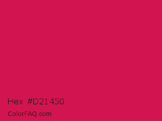Hex #d21450 Color is a normal rose color and the nearest color is Debian Red #d70a53. Hex code #d21450 and RGB value is rgb(210,20,80). In RGB color space, this color is composed of 82% red, 8% green, 31% blue, In CMYK color space, this color is composed of 0% cyan, 90% magenta, 62% yellow , 18% black , In HSL color space, this color has a hue angle of 341° , 83% saturation and 45% lightness.